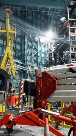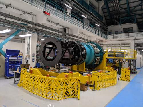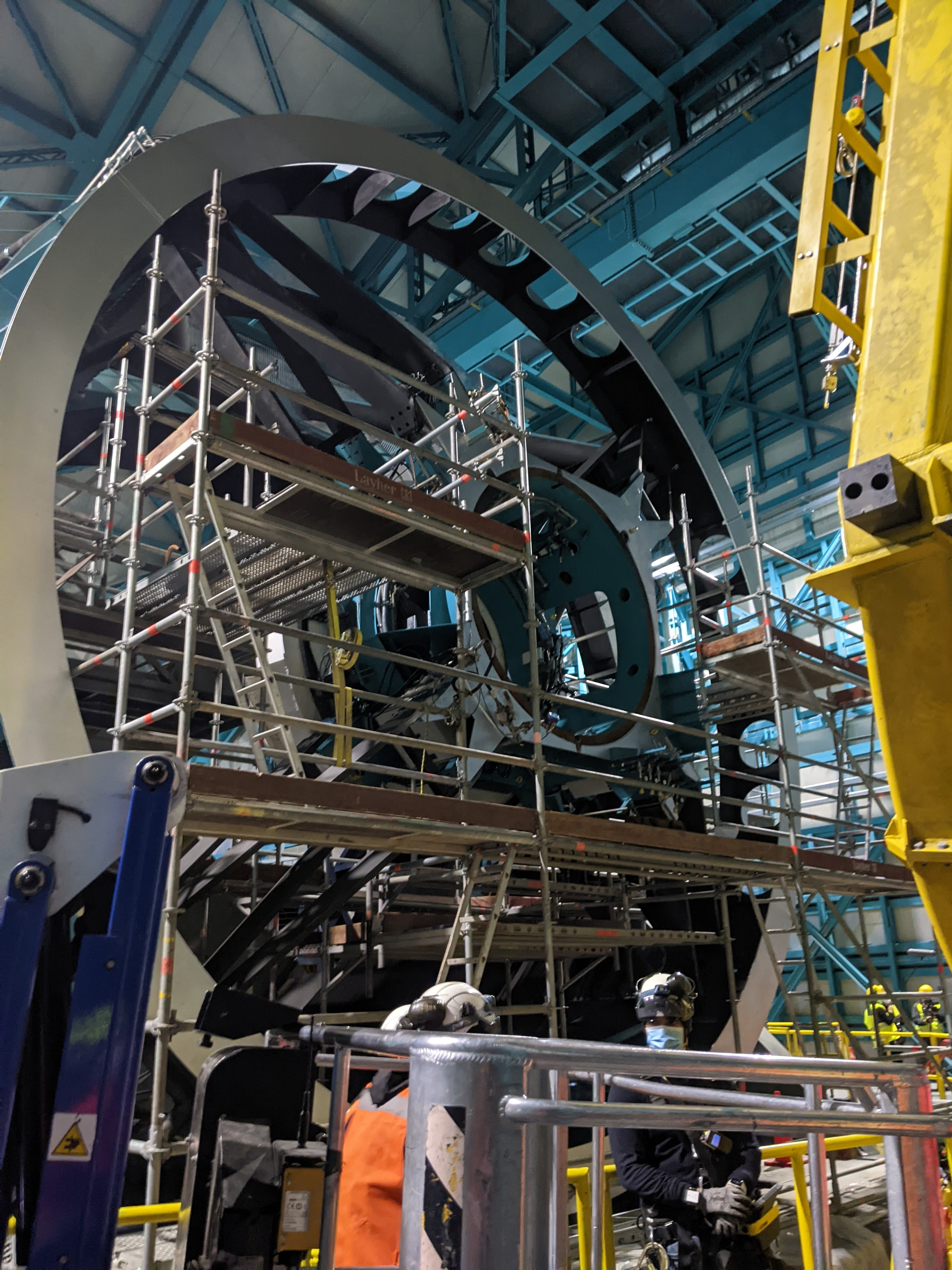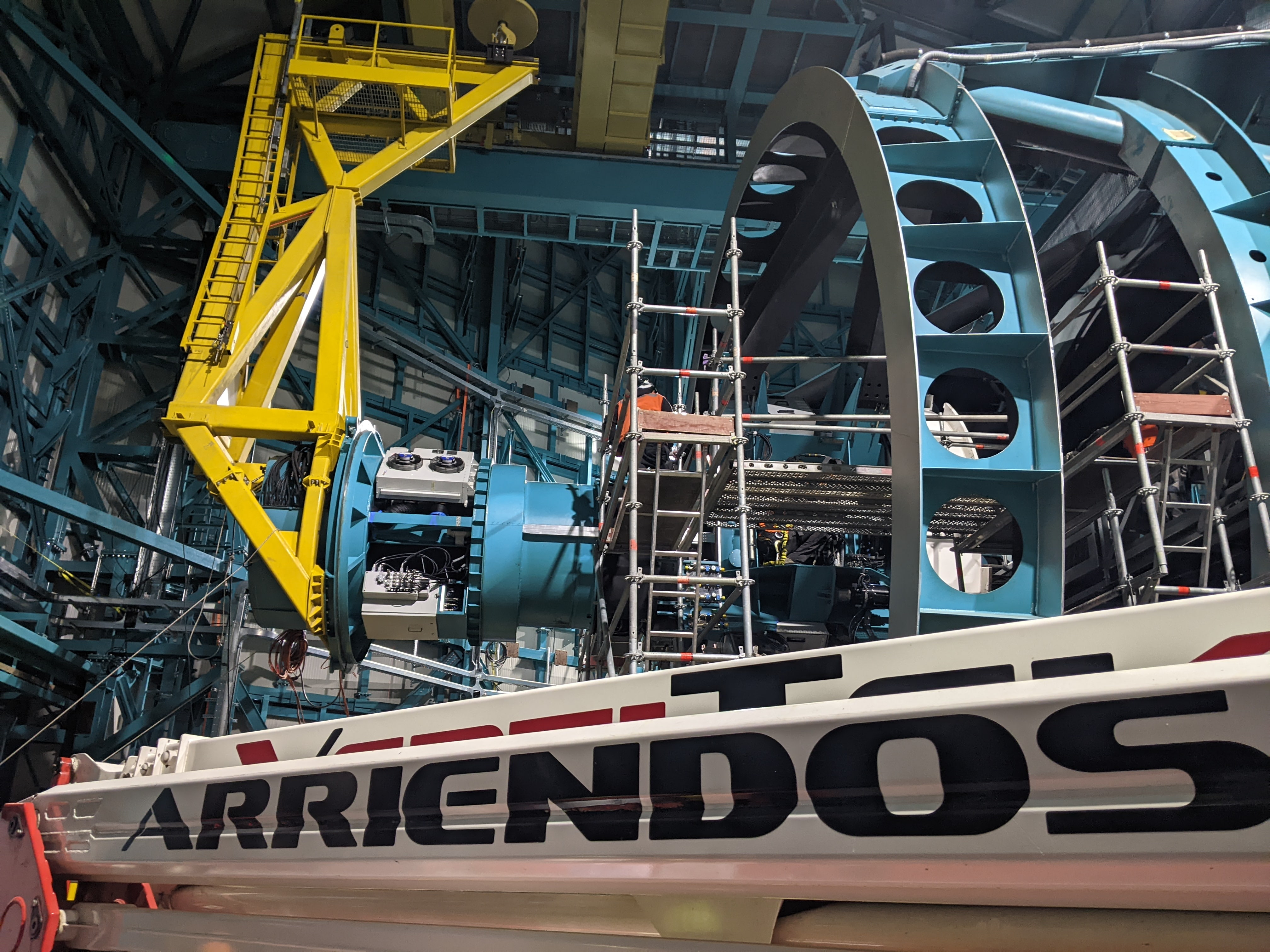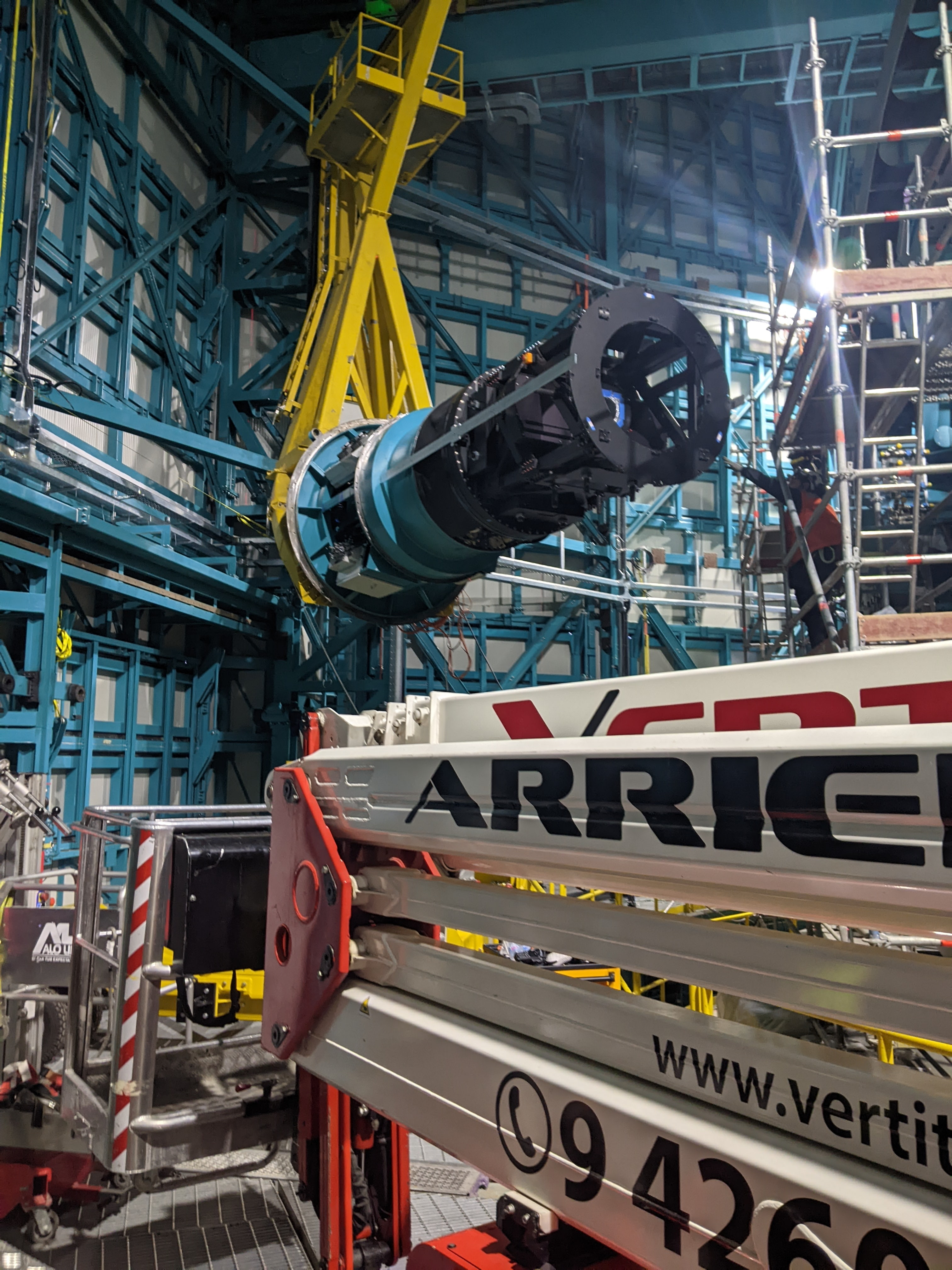 The installation process itself is fairly straightforward but takes a long time since everything has to be done slowly and quadruple-checked. With the telescope horizon-pointing (i.e. tilted 90 degreed, or all the way sideways, such that the top end is now on the side), the entire teal/black assembly gets lifted by a tall yellow lift fixture and then carefully threaded into a cylindrical opening in the top end of the telescope. There are some guide rails for the first part of the installation but the tight clearances are mostly controlled by a skilled crane operator and some technicians up on scaffolding.