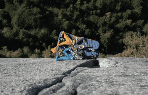 5:15pm: Third time is the charm! I manage to squeeze up six-ish feet of this awkwardly small chimney crack by shoving my chest and feet all the way in even though my hips don’t fit because of all the gear on my harness.