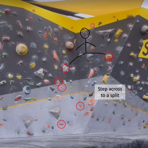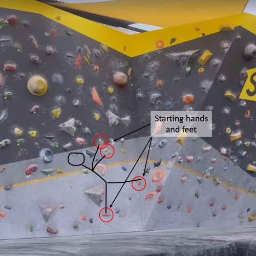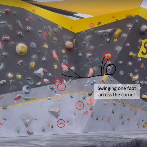 Anyways, on one particular boulder problem, there was a dynamic jump from the left side of a corner to a big hold about a body length away on the right side of a corner, followed by getting your feet super high on the left side until your body is almost horizontal and then pulling yourself up and over the big hold into a horizontal plank position on the wall with and then bringing one foot over to your hands and you’re now standing in a split straddling the corner and breathing hard. If none of that made sense, just know that it was a powerful move and/or scroll through these handy slides. Actually, definitely scroll through, I worked hard on these.