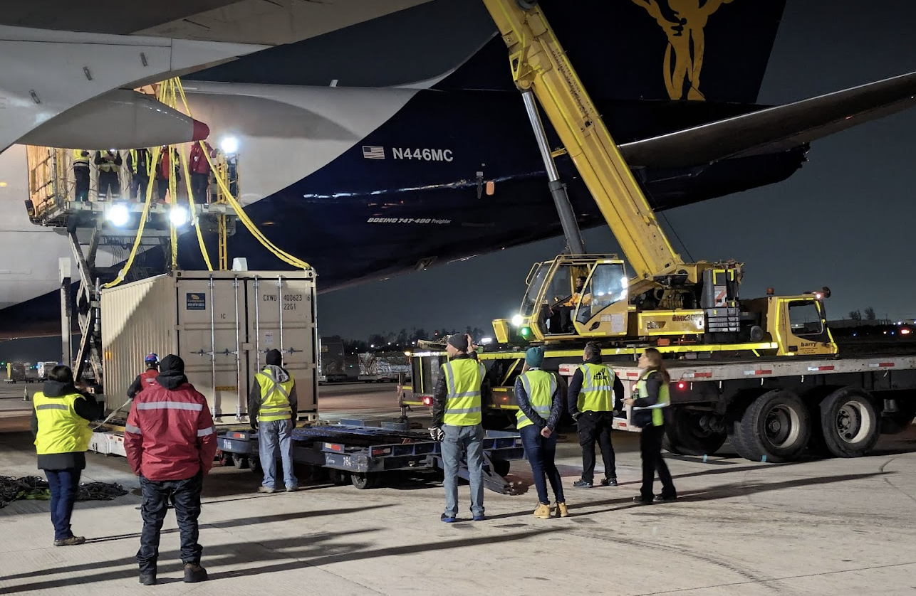 Let’s back up to the weekend before the flight. I got a last-minute text that the air cargo handling company that was going to unload the airplane in Santiago was starting a strike starting on Monday, only two days before the Wednesday morning planned arrival. After some scrambling, the decision was made to switch handling companies, which also meant we had to pull new permits to get access to the tarmac for our trucks and mobile crane. At that point I had been in talks with the original company for several weeks, making sure they understood the importance of the cargo and the unloading sequence and plans for the crane, etc. Cramming all of those conversations into a single day with the new cargo handling company was a bit stressful, especially since it happened to be the same day that all of the support equipment was being picked up at SLAC and taken to the airport. I wasn’t exactly overflowing with free time.