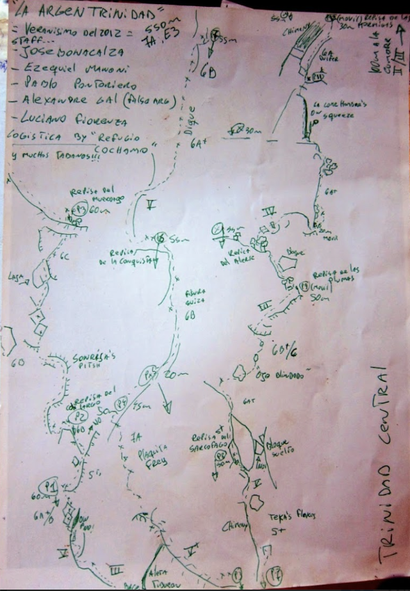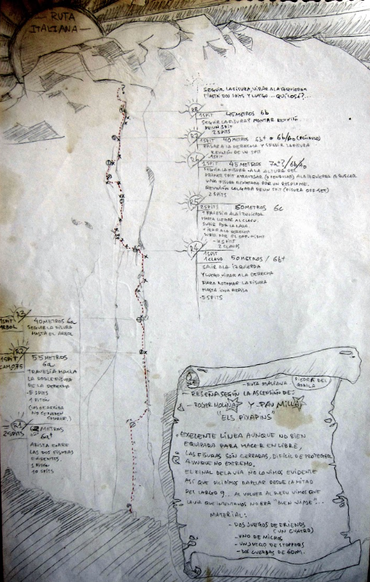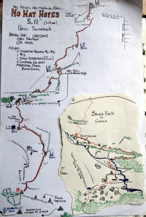 We spent the morning looking at the climbing topos (i.e. route descriptions) that are available in a big red folder at one of the campsites. Some of them are incredibly beautiful, and others are chicken scratch, but it’s very cool to see the hand-drawn topos of all the routes people have put up over the years. “Putting up” or “opening” a route involves picking the exact line, explaining how to find it, and usually includes installing metal bolts at the top of each pitch for belaying. It sounds simple but can be a very involved process, especially for longer routes, so we are very grateful for the folks who take the time to put up these routes and then log the information in a topo so others can also enjoy the climb. Sometimes information is perhaps a bit more sparse than you’d like, but it all adds to the adventure.