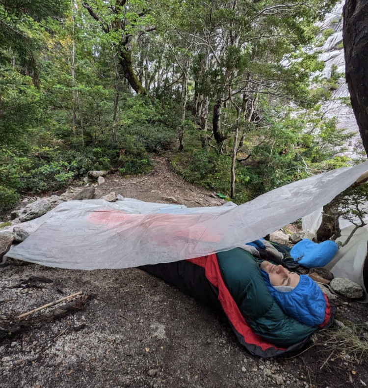 Because of the ongoing rain, I tried to use a plastic tarp make a mini shelter for us to sleep under. A sort of engineering in the wild. I was mostly successful, and it looked cool, and definitely helped a little bit, but we got still got pretty wet overnight as it kept raining much harder than anticipated. My sleeping pad also deflated pretty quickly so I didn’t have insulation between me and the ground and got very cold. Overall a pretty uncomfortable evening/night, but at least it can only go uphill from here.