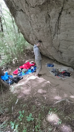 It’s actually not quite a cave, more like a giant overhanging boulder, and 16 or so people could sleep in that space well-protected from the rain. Under the rock there was also a little fire ring with benches in one corner, and some people had stashed some food and gear along the wall or hanging from bolts on the rock itself. We definitely regretted not exploring further up the trail the previous night to find the protected sleeping area, but at least the next night would be dry no matter what!