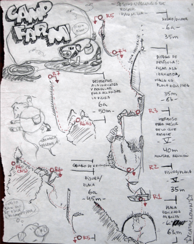 We eventually repacked our stuff yet again to go out climbing for the afternoon. There is one longer route close to the main campsite called Camp Farm. It was nice not to have to hike three hours up into one of the valleys in order to get to the climb, but the hourlong approach did involve crossing a river. Our two options were walking in the river or using a Tyrolean traverse, which is a rope tied across the river between two giant trees. Basically you attach yourself via your harness and then pull yourself across on the rope. We ultimately decided to ford the river and it occurred to me that I learned that word playing the Oregon Trail game when I was 8 (the one where you die of dysentery more than half the time).