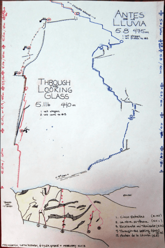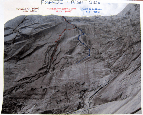 The plan was to do a route in the Valle Anfiteatro (i.e. where we had hiked to and spent the night) called “Antes de la Lluvia” (which translates to “Before the Rain”). It’s a ~10 pitch climb on the Espejo Wall which is also confusingly referenced as the Escudo Wall in some guide topos.