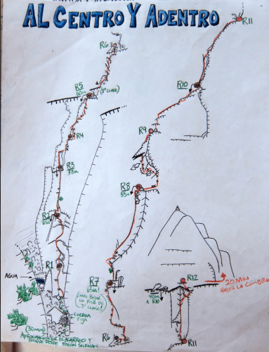 The route of the day is called “Al Centro y Adentro” (To the Center and Inside) and it’s the climb I was most excited about so far on the entire trip. The route description says that this climb “makes its way up the center and literally inside Pared Atardecer. It’s one of the most repeated at its grade, qualifying it as a don’t-miss route.” The name “Pared Atardecer” translates to “Sunset Wall”, so you know it’s going to be pretty up there. Plus the 12-pitch climb is the longest and hardest one we’ve attempted thus far in Cochamó. All very exciting!